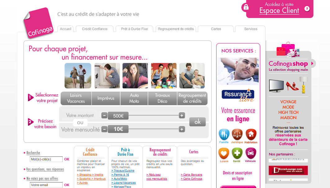 L’entreprise Française Cofinoga est l’acronyme de La Compagnie Financière Des Nouvelles Galeries. La société de crédit à été créée en 1968. La marque Cofinoga est d’abord spécialisée dans les crédits à la consommation pour particuliers. En devenant LaSer Confinoga elle s’est élargie vers les programmes de fidélisation, les centres d’appels, la monétique pour les magasins. La marque est présente dans 7 pays européens.Ce changement de logo est dû au regroupement, annoncé par le groupe courant 2011, entre la société Mediatis filiale du groupe et Cofinoga. Le changement d’image n’est pas encore effectif. Le nom du regroupement reste Cofinoga.