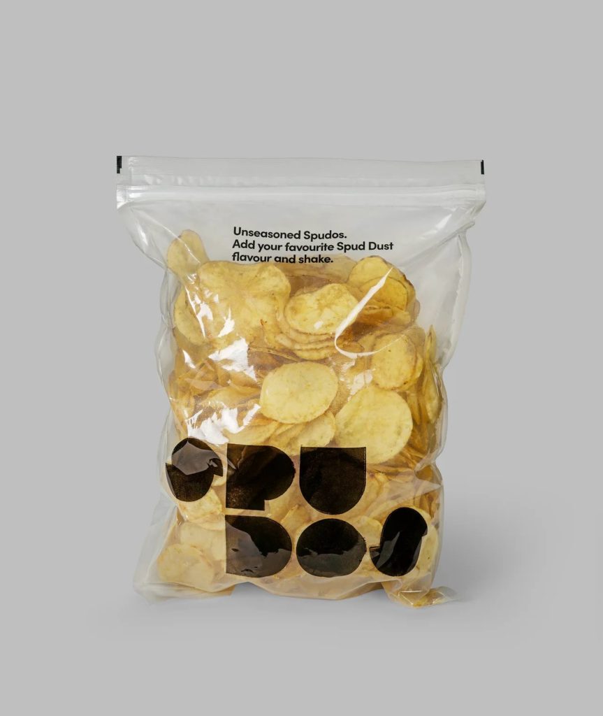 Spudos ne se contente pas d’un joli paquet : la marque va au bout de sa démarche responsable. Les chips sont conditionnées dans un sachet 100% compostable, à base de cellulose, bien loin des emballages plastiques traditionnels du secteur. Le packaging transparent laisse entrevoir le produit, renforçant le lien de confiance avec le consommateur. Mention spéciale pour le petit sachet d’assaisonnement séparé, baptisé « Spud Dust », qui permet de personnaliser son snack selon ses goûts. Un clin d’œil aux célèbres « salt’n’shake » britanniques, les premiers paquets de chips vendu sur le marché par The Smiths Potato Crisps Company Ltd, fondée en 1920 à Londres. L’entreprise fournissait un sachet de sel séparé au paquet chips, qui étaient vendues à Londres dans des sacs en papier sulfurisé. D’abord commercialisées sous le nom de Salt “n” Shake, les chips nature avec sel facultatif sont encore vendues aujourd’hui.