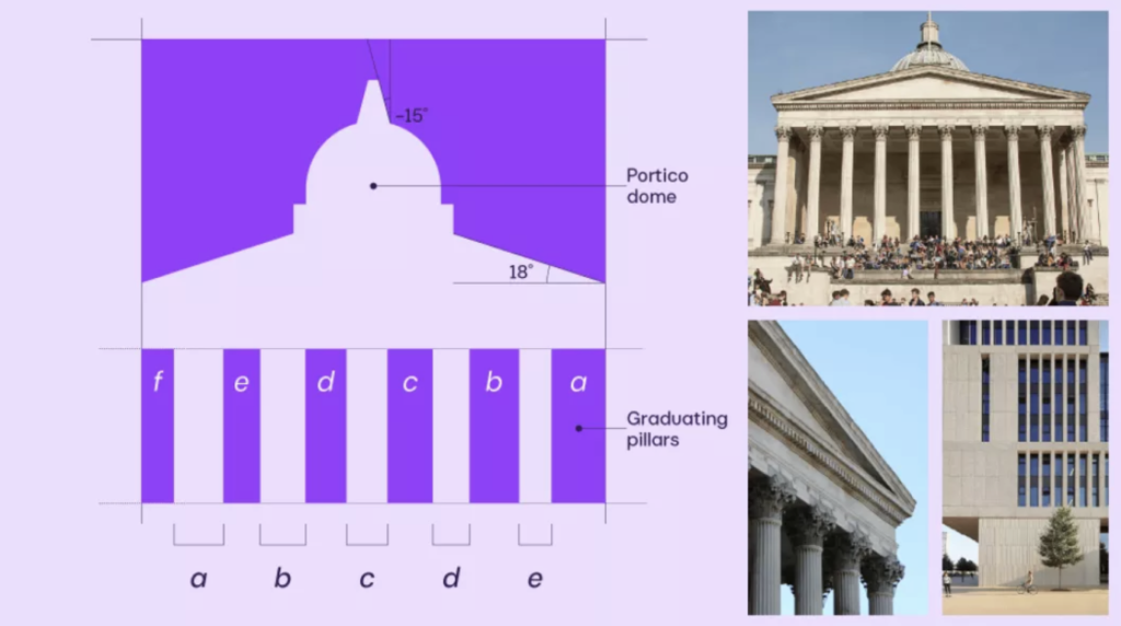 Au cœur du système graphique se trouve une représentation stylisée du Wilkins Building, conçu en 1827 par l’architecte William Wilkins. Son portique néoclassique, emblématique du campus de Bloomsbury, devient le point de départ du logo et permet de relier l’image de marque de l’université à un lieu immédiatement reconnaissable.